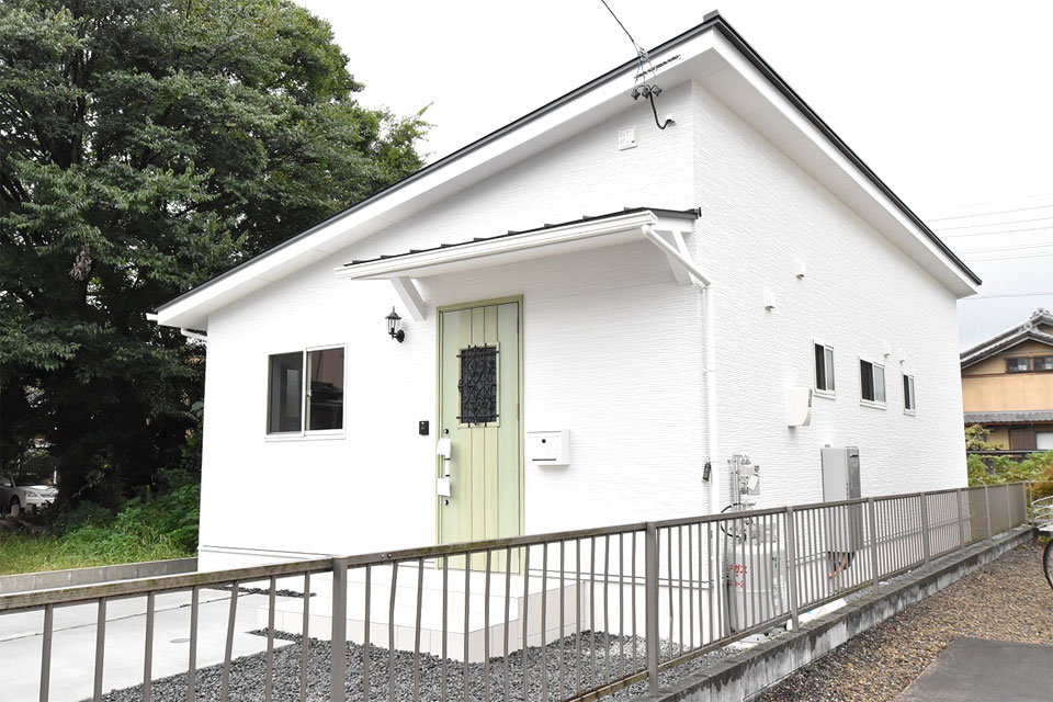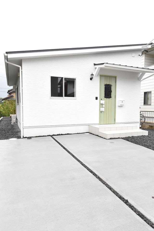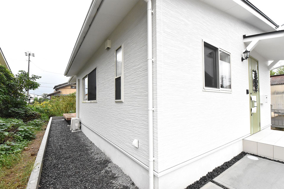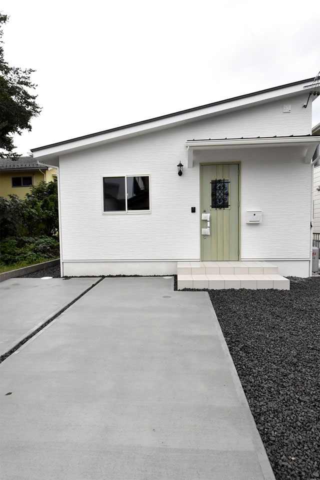 | 平屋がご希望で、F様(お施主様)のご両親様のために計画をされました。道路向かいにF様がお住まいですので、いずれ代が変わった時のことも考えて、リフォームをしなくていいような間取りとしました。外観は南側に片流れのすっきりとしたデザインです。 |
