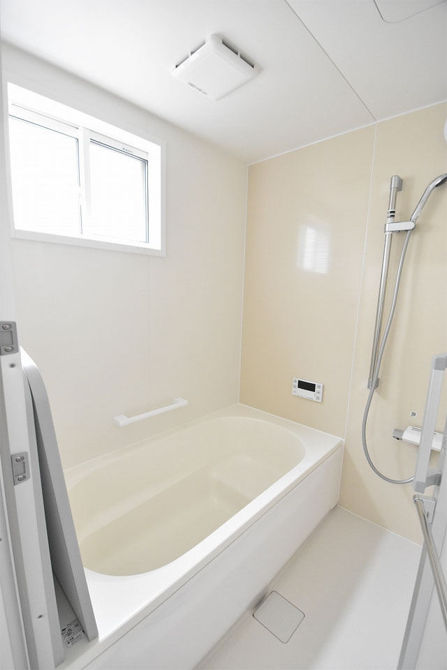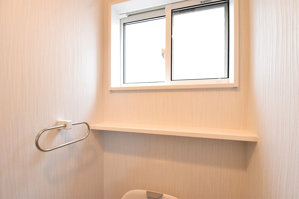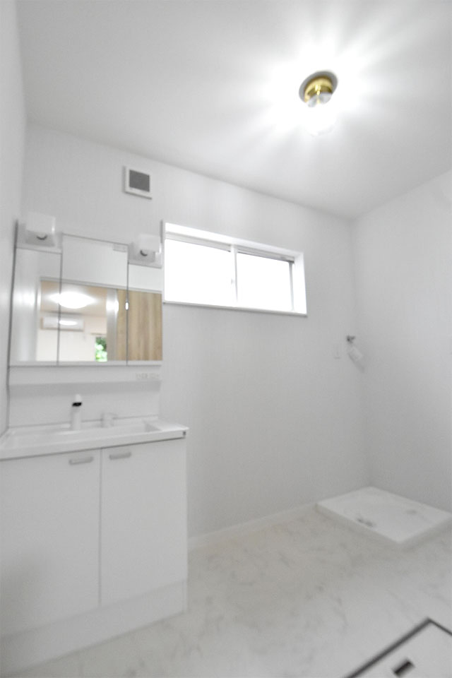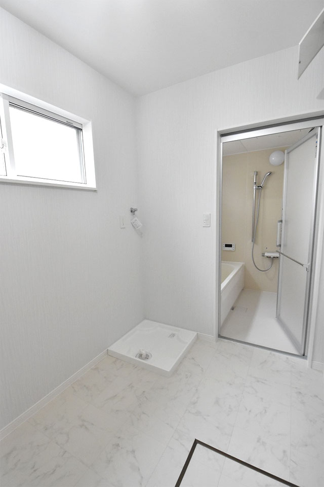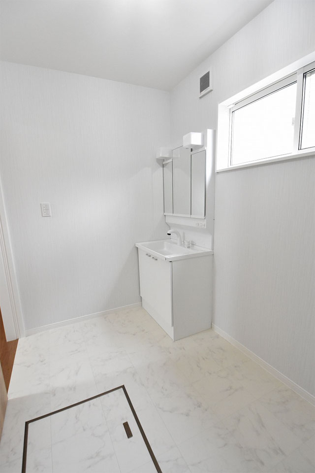 | 間取りは、東側道路の敷地で東入り玄関、中央南側にLDKを配置し、その奥に洋室2室(仏間スペース込み)を計画しました。水回りはLDKの北側に配置し、LDKからも奥の洋室からも近い位置にWC→洗面・脱衣室→浴室の並びで配置しました。 |
