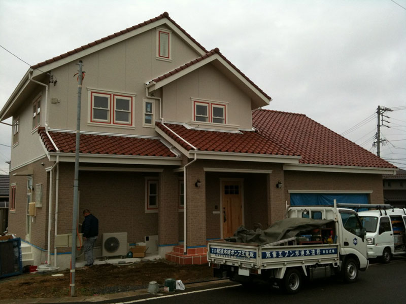 いよいよ完成ですね。長かったようで短かった楽しいお打ち合わせタイムでしたね!外観は最初のご希望通り、明るい南欧風に仕上がりました。内装も外観に等しく明るい色調で色調を選んでいただきましたので、付近が密集した町の中でも圧迫感のない仕上がりになりました。