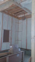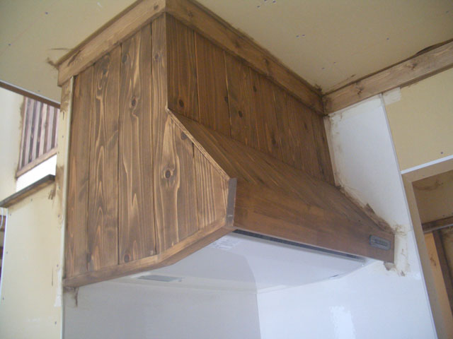 内部の造作もどんどん進み、キッチンの壁には木の板が貼られていました。木の板はこの後、白くペイントされる予定です。あこがれのナチュラルシンプルカントリー的なキッチンになるのかな?…とても楽しみです。 |