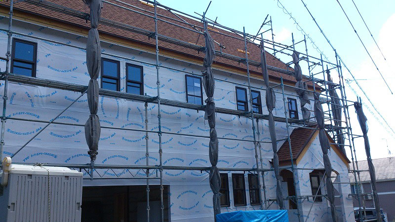 外部は足場を外すばかりとなっています。外壁の色も何種類もサンプルを作り、時間帯(朝、昼、夕方)に外で見ていただいて決定しました。サンプルで見た感じの色と実際に塗られた色とでは感じ方が違ってくると思いますので、又、少し濃いめの色でしたので慎重に決めさせていただきました。気に入っていただけて良かったです。