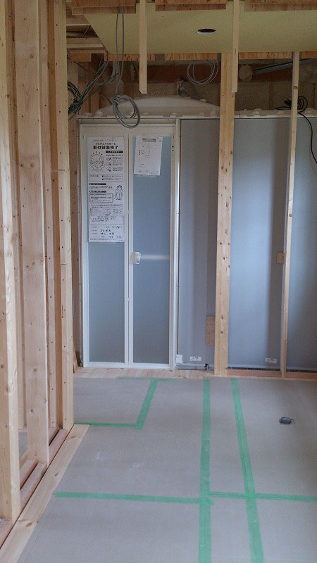 ウレタン吹きつけがされました。壁、天井はもちろん浴室ゾーンもしっかり!同時に電気配線の方も始まりました。 |
