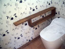 トイレの壁紙は、ちょっと可愛いものを選びました。便利な収納棚も取り付けてもらいました。