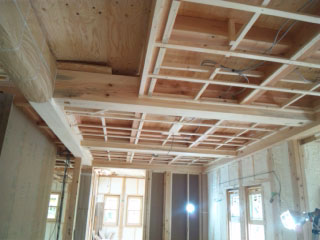 内部も天井下地や電気配線、水道配管が終わり、造作が進んでおります。コンサバトリーの天井は板張りで勾配状に貼ります。3ヶ所付けた天窓が映えるデザインだと思います。 |