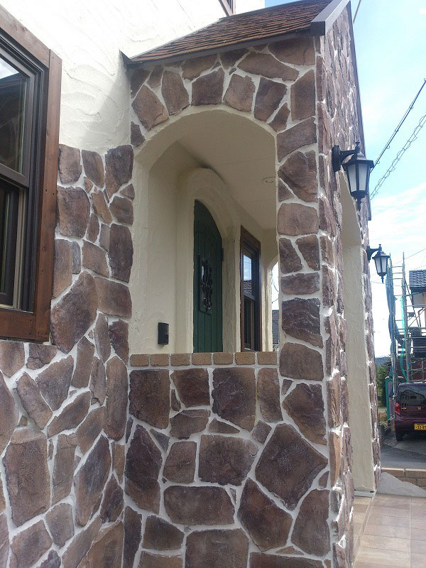 久々の我が家にやってきました。玄関前には、素敵な壁ができていました。私たちのあいまいな希望が、とっても可愛く実現されていました。ランダムに…って、意外と難しいですよね。(笑)