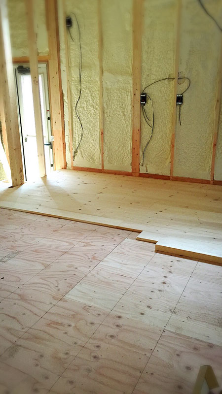 外部の構造用合板を貼り終え、瑕疵保証の構造の検査も無事終了致しました。内部は断熱材のウレタン吹き付けが終わり、いよいよ造作へと移っていきます。