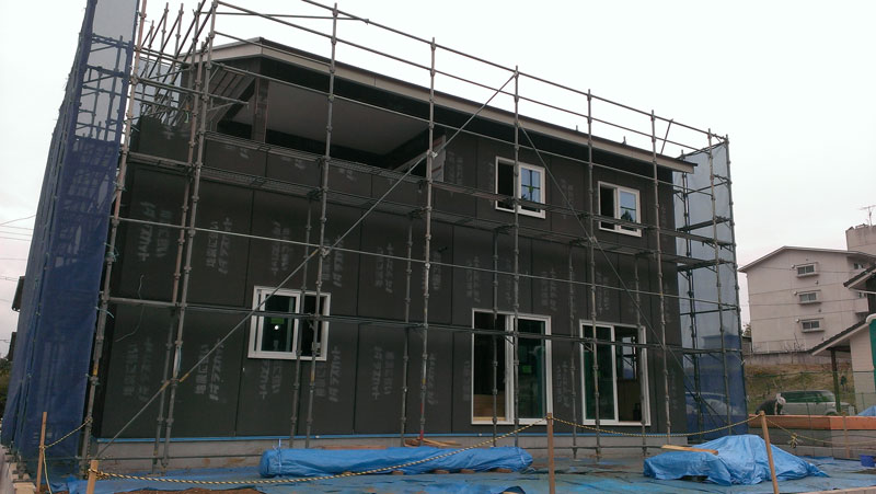 外部は、防風シ−トの上に横木を打ち、さらにその上にサイディングのボードを貼る作業をしていました。サイディングの素材はコンクリートとのこと。防火性がありそうです。