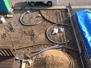インナーテラスの床面はピンコロ石を貼るご希望ですので、只今材料の資料を集めております。間もなくご覧いただき、お選びいただく予定です。