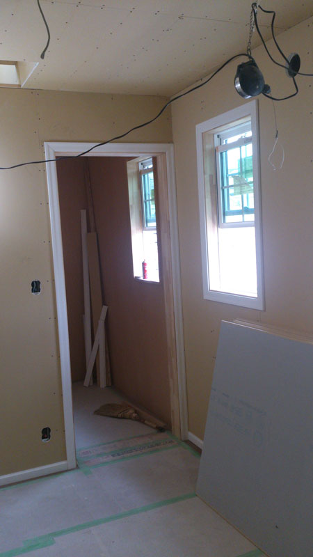 この日は大工さんは来てみえなくて、内部は見ることができなかったのですが、ぐるっと裏手にまわってみると勝手口の扉もついていました。窓と同じ白い縁の扉です。