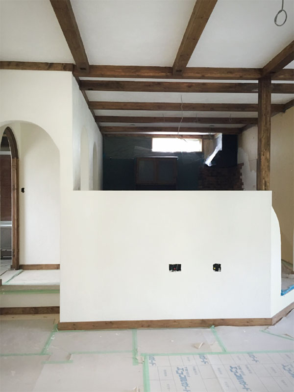 一階のリビングからキッチンダイニングの仕切りとアーチ壁ができました。