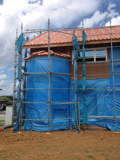 工事は外部の防水紙を張り、R部分の壁や屋根を造作中です。内部は電気配線が終わり、天井のプラスターボードを張っております。今週末にはユニットバスを設置する予定です。