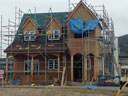 建物のご希望はメープルホームズで言う「ケープコットスタイル」の外壁にブリックタイルをはったイメージに近いものです。屋根は外壁のブリックタイルに合うアスファルトシングルの茶系を貼りました。内装は外観とはイメージが違い、イングランド風のクラシックスタイルで仕上がる予定です。窓はおっしゃるとおり赤茶系のブリックタイルによく映えるきれいなホワイト色です。