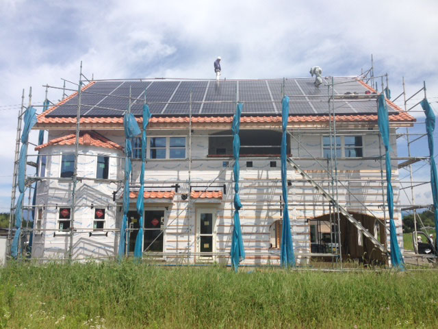 太陽光パネルの設置が完了しました。横井さんが瓦メーカーと交渉に交渉を重ねて仕入れてくれた素焼きの瓦がほとんど隠れてしまい、申し訳ないです。