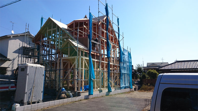 シートが外れていました。こうやって全体を見るとますます家が出来てきたという実感が湧きます。梁の色もイメージ通りで満足です。 |