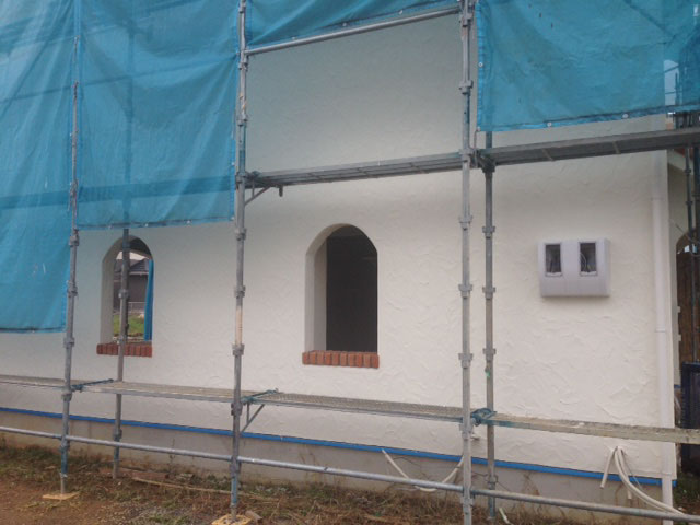 南正面の3連アーチがとてもバランスよく、きれいに仕上がりました。現在は外壁の通気シートを貼り終え、順次外壁の仕上げへと移っていきます。