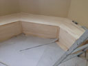 内装は廻り縁、建具枠、窓枠等を柔らかく見せるために、削って凹凸に面取りをしました。コンサバトリーの収納兼ベンチを造作で取り付けましたが、多角形部分ですのでとてもかわいく仕上がりましたね。塗装はオスモのチーク色を採用しました。この後しっくい塗ですが、柔らかく自然な仕上げになるようコテむらをつけて塗る予定です。 |