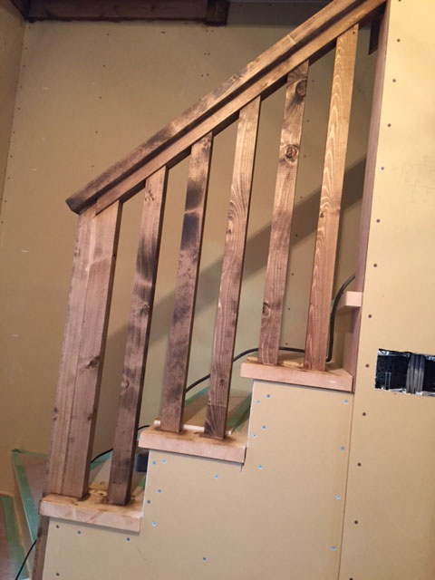 二階です。手すりと柵がつきました。大工さんに貸してもらい、面取りに挑戦しました。 |