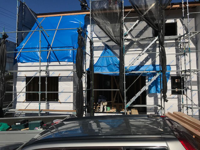 昨年末に見に行ったら、屋根もサッシも付いていました!!気になって毎日のように見に行っていますが、どんどん出来て行くのがとても楽しいです。