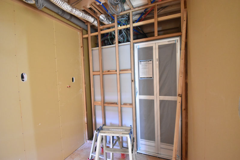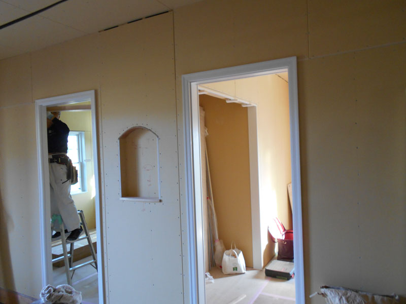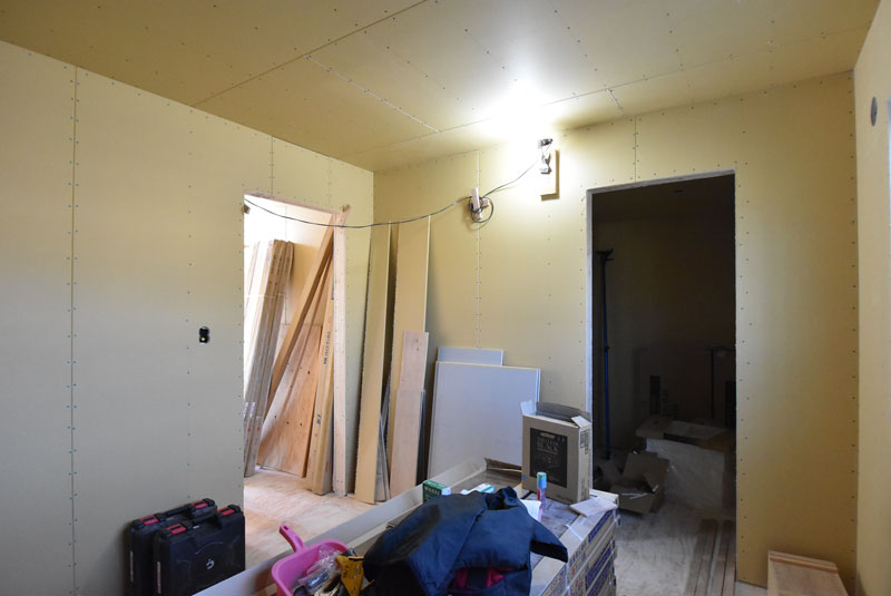 家づくりが進んで、ほぼボードは完了している様子でした。図面段階で変更させていただいた洗面入り口と、パントリー入り口のR垂れ壁も形成してありました。現物を見ると、Rにして良かったと思います。