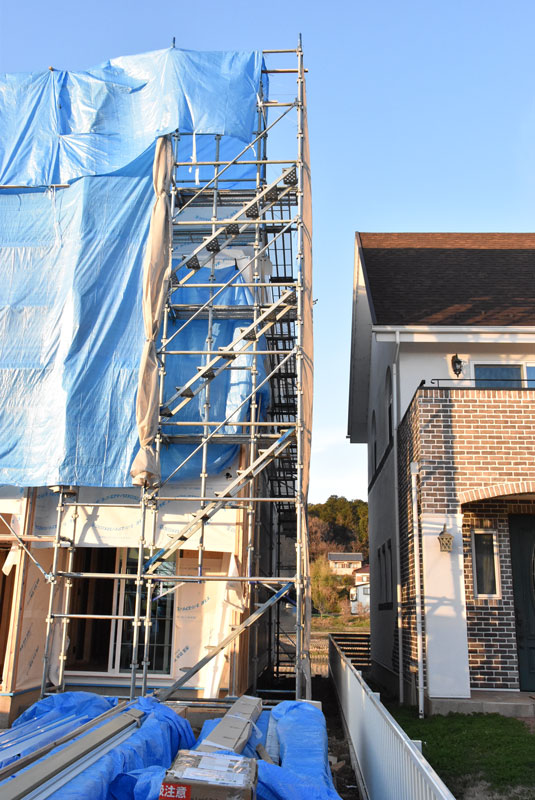 外部工事がほぼ終了し、足場が外れました。内部は主な造作が終了しましたので、これからシステムキッチンの備え付けや照明器具付けなどにかかります。