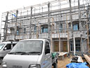 工事は7月下旬に基礎が終了し、7月の終わりに上棟しました。お盆のお休みを挟み、現在は内部は床組みを、外部はタイル貼下地取り付けを行っています。