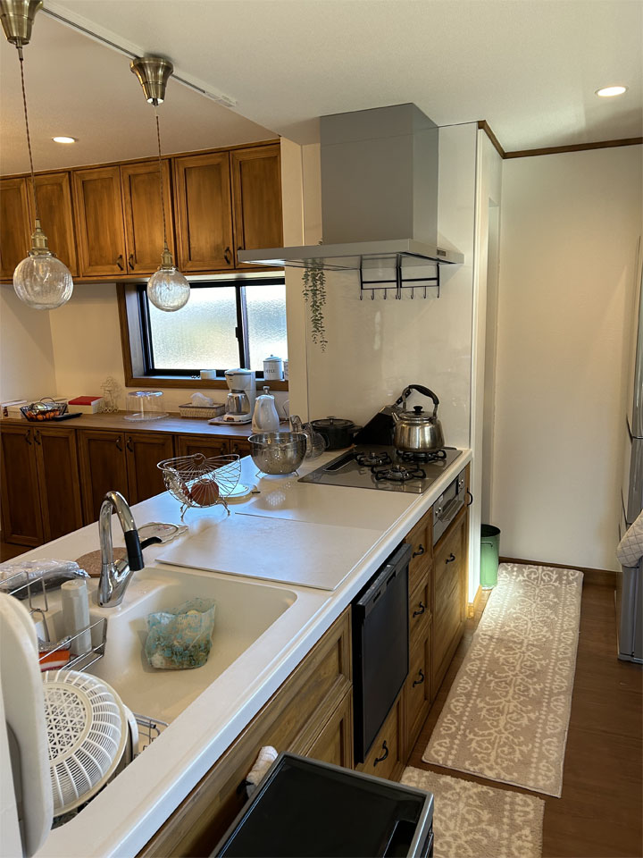 輸入材料をふんだんに使用し、和風なイメージからアメリカンタイプの洋風なイメージへ変えます。キッチンはグラフテクト社製のアイランド型で、モスグリーンを選ばれました。 |
