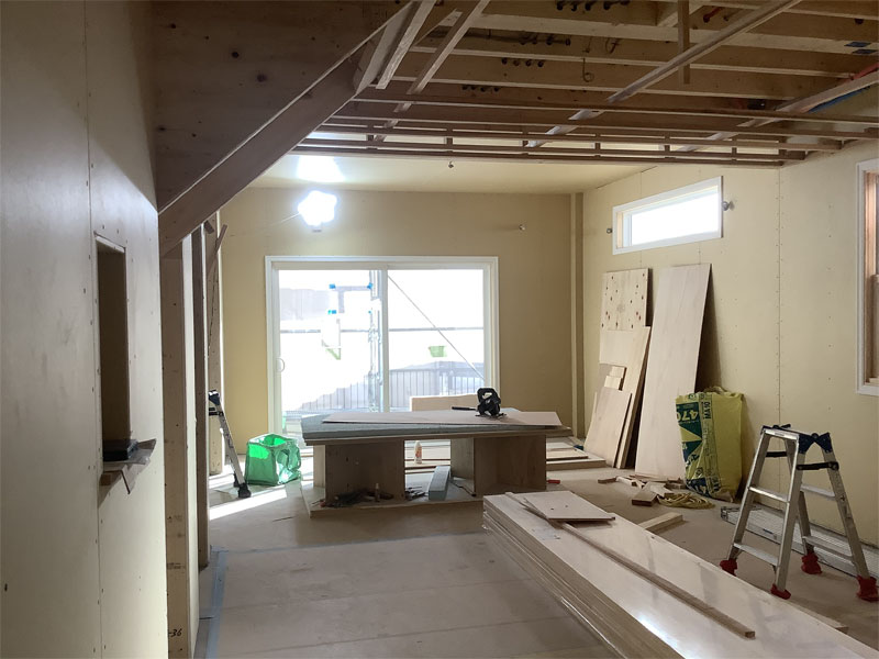 内部は造作工事が進んでおります。アルコーヴソファー部分が完成しました。