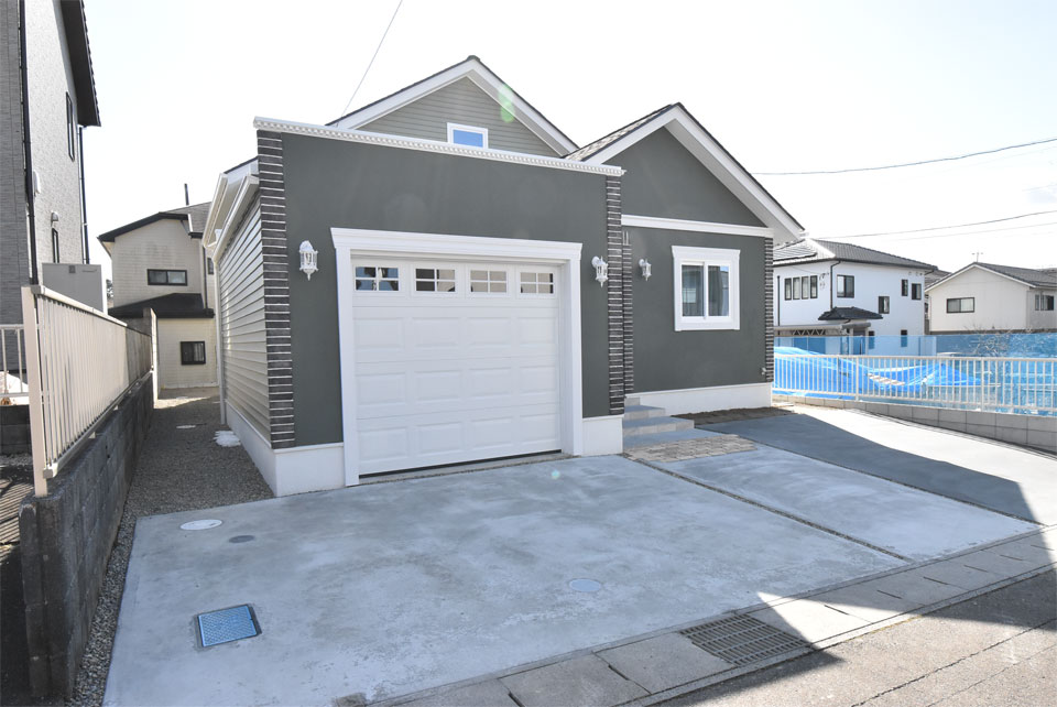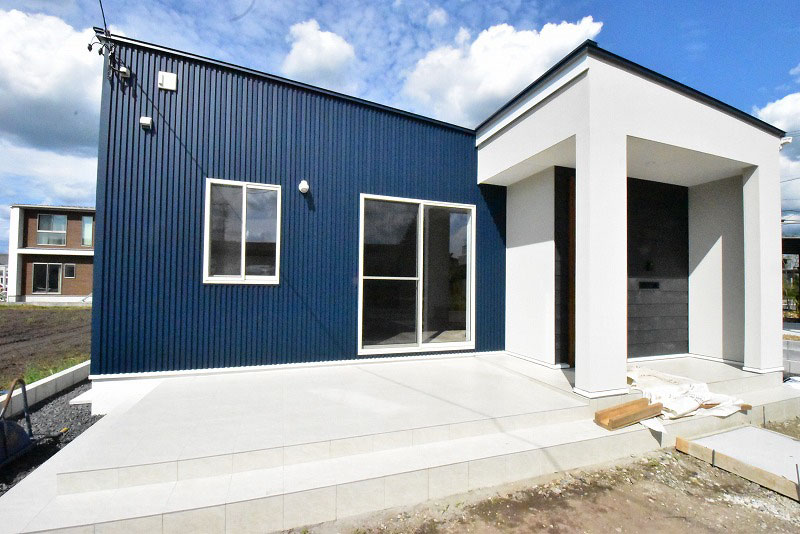 写真に写っている奥のブルーの樹脂サイディングの建物は、私どもで建築させていただいたA様邸(2017年12月完成)です。こちらのT様は奥様同士がご姉妹で、お隣同士で建築をされました。T様がイエローの樹脂サイディング張り、A様はブルーの樹脂サイディング張りでアメリカンスタイルの家が2件並んで立っています。