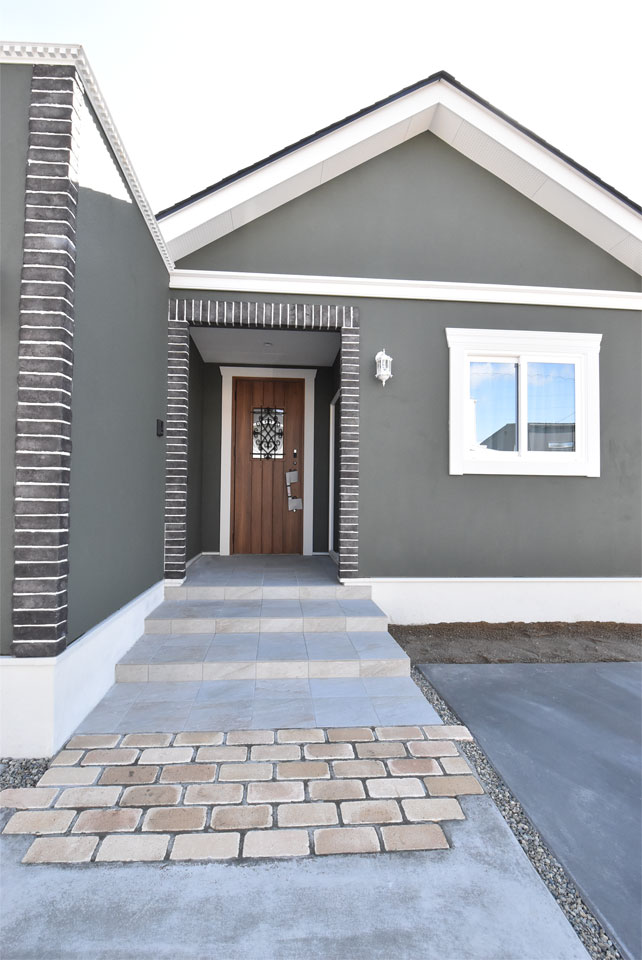 平屋がご希望で、輸入住宅風の樹脂サイディングを使った切妻屋根の家です。樹脂サイディングはレンガ色をご選択されましたので外部の建具類はホワイト色とし、枠を太めにしてデザインを取りました。