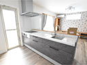システムキッチンの搬入も終わっております。現在はクロス張りの下地処理が行われております。クロス張りが終了したら、照明などの器具付けの工事に入ります。 |