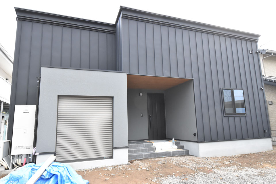 平屋がご希望で、F様(お施主様)のご両親様のために計画をされます。道路向かいにF様がお住まいですので、いずれ代が変わった時のことを考えて、リフォームをしなくていいような間取りとしました。外観は南側に片流れのすっきりとしたデザインです。