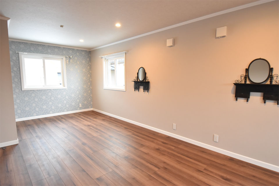 内部はモールディングと建具は白を基調とし、ビニールクロスの仕上げとなります。M様邸ご見学の際、アルコーヴソファーを気に入っていただき、形状は違いますがこちらでも採用させていただきました。シングルサイズのマットレスが入る大きなソファーになります。