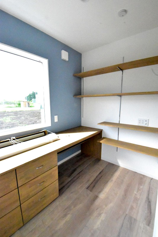 間取りは、東側道路の敷地で東入り玄関、中央南側にLDKを配置し、その奥に洋室2室(仏間スペース込み)を計画しました。水回りはLDKの北側に配置し、LDKからも奥の洋室からも近い位置にWC→洗面・脱衣室→浴室の並びで配置しました。洋室のクローゼットはもちろん、玄関わきに物置兼シューズクローゼット、LDKに大きめの収納スペースなど、各部屋に隠せる収納のスペースを配置しました。