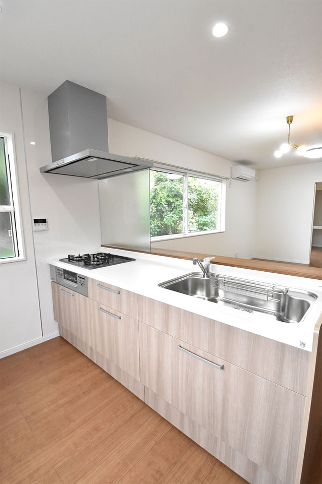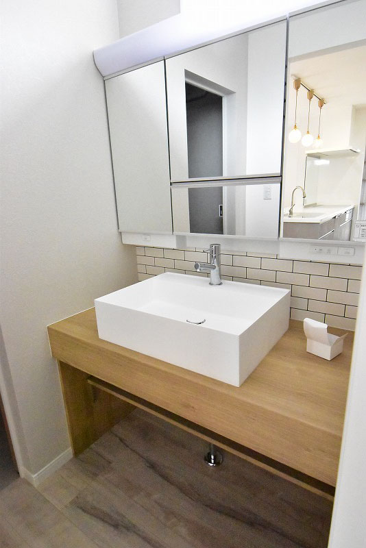 浴室を1坪タイプのユニットバスとし、トイレもすべて取り替えました。洗面所は造作タイプの洗面台が外から見えるよう、オープンタイプとします。