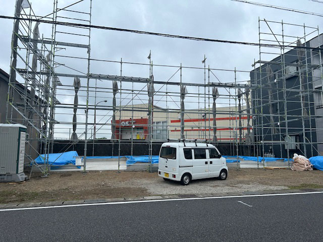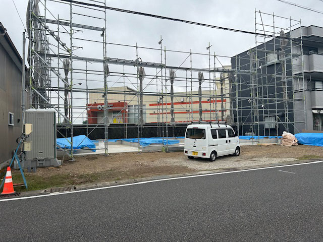 写真は基礎工事が終わり、足場が組まれて土台部分の工事中のものです。上棟に向けて作業が進んでおります。