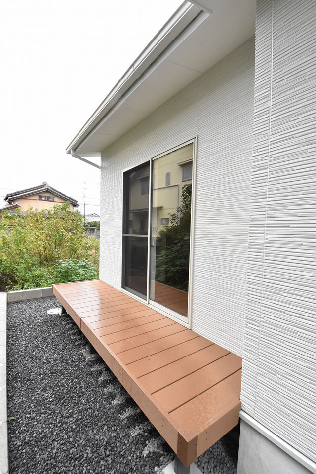 ご高齢の方がお住まいになられますのでなるべく段差を少なくし、物干しデッキは掃き出し窓との段差は無しで、玄関ポーチの蹴上げも極力緩く計画しました。