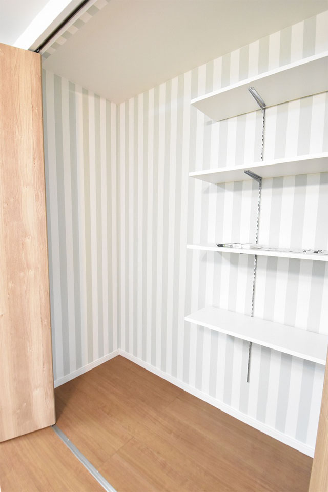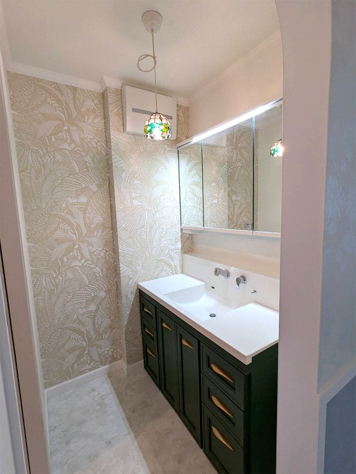 メインのクロスに合わせてアルコーヴソファー部分は紺色で、洗面はブルーの花柄で仕上げ、統一感が出ております。 |