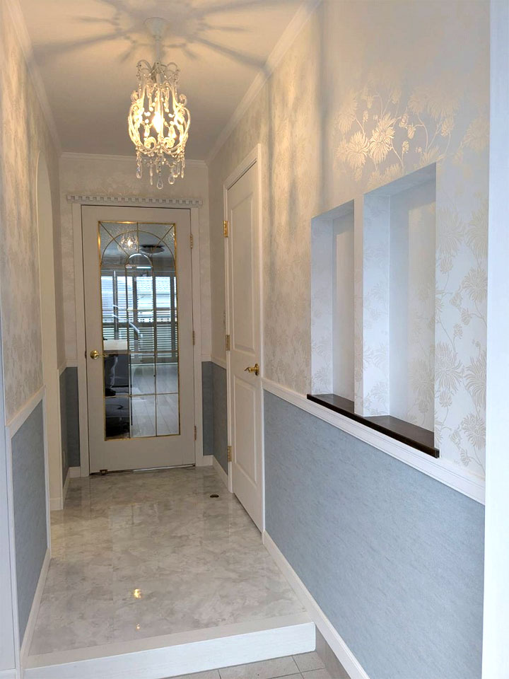 腰壁や造作の扉は、それに合わせて濃い目のブルーグレーやベージュ色にされました。 |