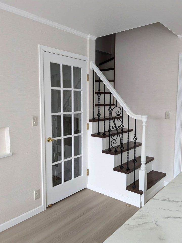 階段手摺はアイアンのデザイン縦格子を取り付けました。これでぐっと輸入風に見えますね。 |