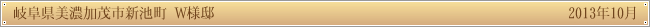 | W様には最初にカタログ資料をご請求をいただきました。その後、可児郡御嵩町のU様邸と土岐市のA様邸をご見学いただき、私どもの建物やコンセプトを気に入っていただきご契約させていただきました。 |