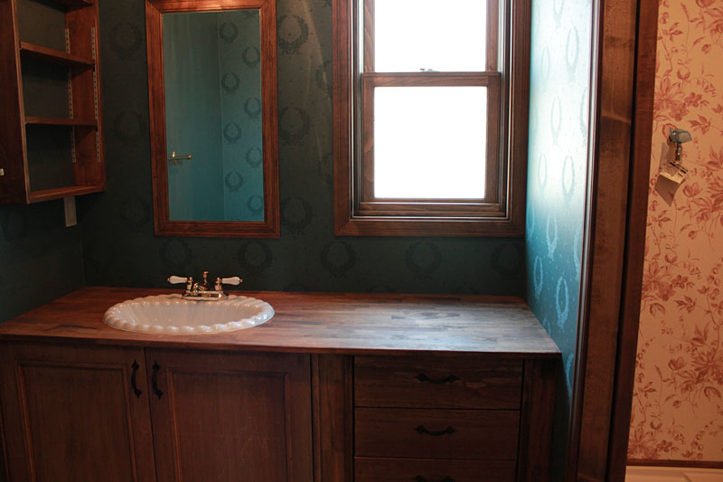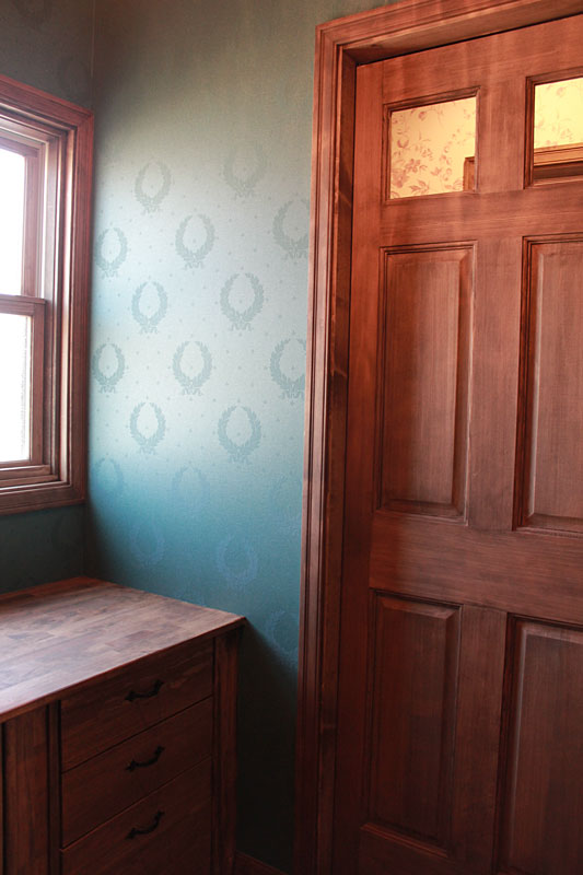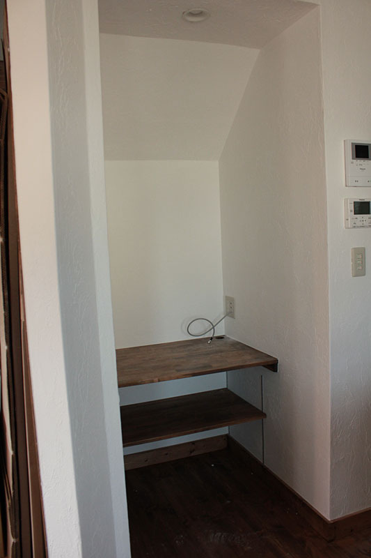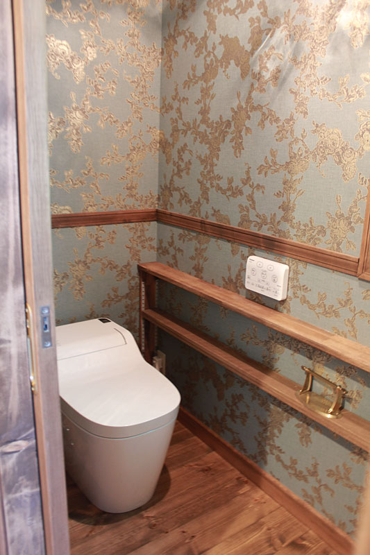 | 奥様がとても悩んでお決めになったダマスク模様のクロスを中心に、クラシックでアンティークなスタイルがよく出た落ち着いた建物になりました。ご主人様の趣味のお部屋にはフィギュアを飾る奥行きの小さいガラス棚を取り付け、照明を当てて楽しんでいただけるようにしました。この部屋をとっても気に入って下さっており、嬉しい限りです。 |