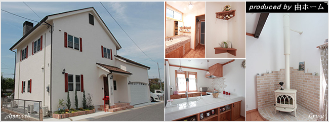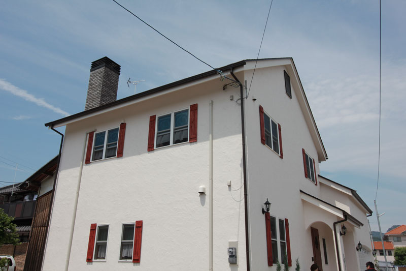 | 外観はすっきりと仕上げた塗り壁で、屋根もすっきりと仕上げたアスファルトシングル葺きですが、サッシ廻りにさし色の赤を使った飾り雨戸を設置しました。内部は1階部分は壁・天井ともしっくい塗がメインで、薪ストーブの周りにはクリーム色のレンガを積みました。2階はクロスがメインですが、各部屋で個性的な柄をご選択いただきました。 |