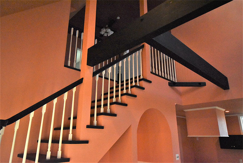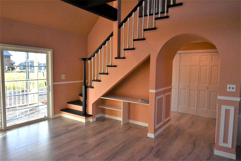 | 玄関ホールからLDKまでの導線上には扉をなくしました。垂れ壁やアーチ天井を効果的に配置し、空間の分割を壁ではなく視覚で造りました。建物内全ての外部に面する壁面、天井面、床下面に発泡ウレタンを吹き付けますので、扉で仕切ることなく広い空間すべてが同じ温度で保たれます。 |