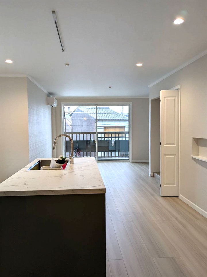 | 鉄骨3階建て構造ですので、間仕切り等は自由に変更ができました。段差のある敷地で2階部分に玄関があり、その階に水回りとDKと和室があったため、それらすべてを改装しました。 |