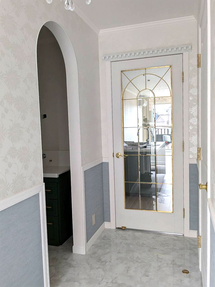 | 外部は1面のみの改装で、玄関ドアを取り換えて枠廻りのモールディングを取り付け、正面部分の外壁のみ樹脂サイディングのブルーグレー色を張りました。 |